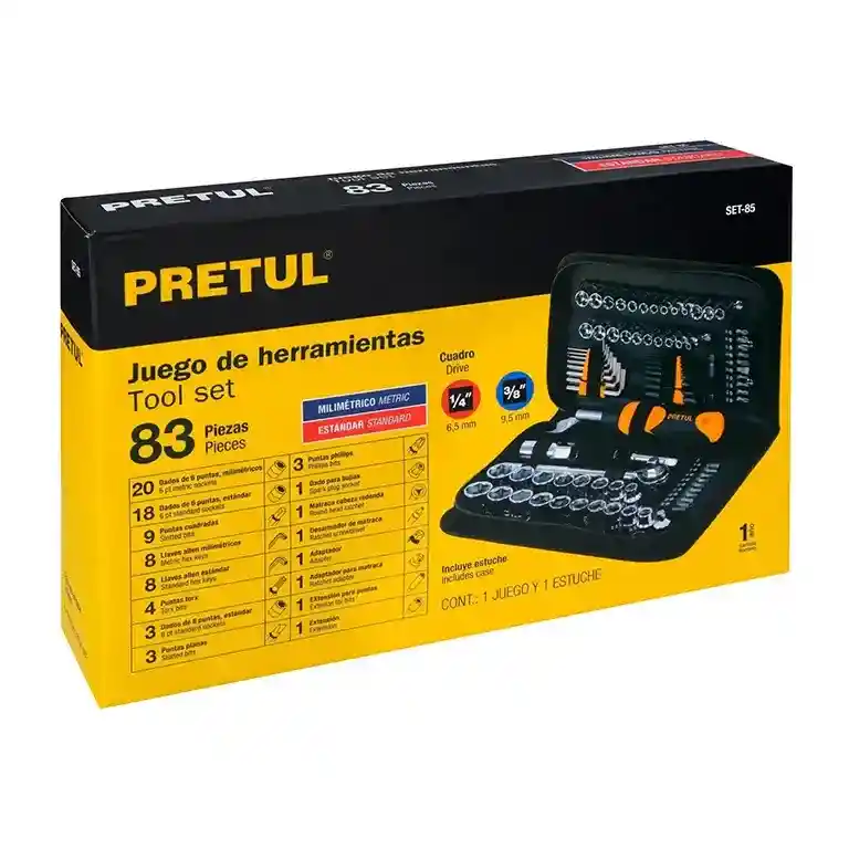Juego 83 herramientas Pretul, incluye una variedad de herramientas esenciales para múltiples aplicaciones, ideal para aficionados y profesionales,