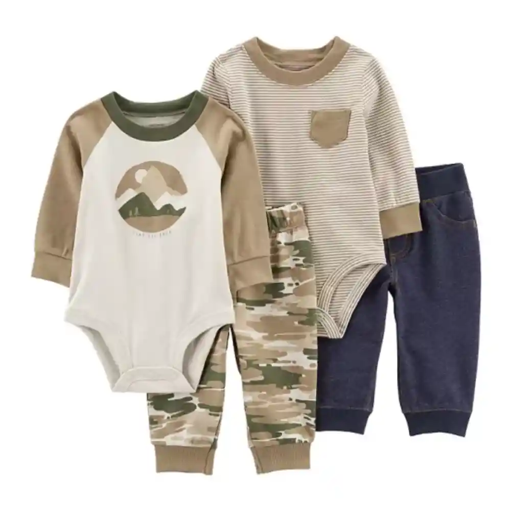 100% ORIGINAL Marca Carters 4 Pcs Características: Cinturillas elásticas en pantalones sin cordones. Bolsillos no funcionales Tres cierres a presión en monos. El conjunto Camuflado presenta un cordón no funcional en los pantalones.