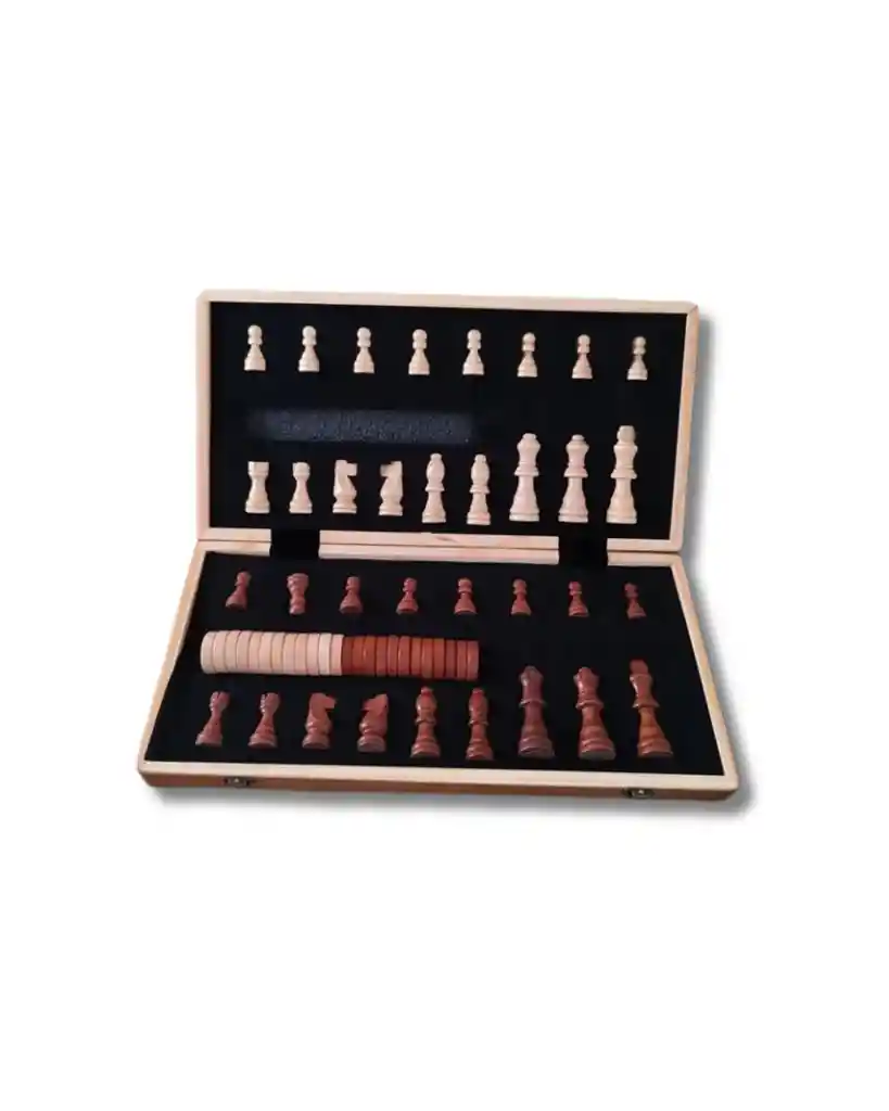 Actividades de concentración y estrategia para niños y adultos ✨ Beneficios: ✔ Estimula la memoria, la concentración y el pensamiento estratégico ✔ Acabado de lujo, perfecto para jugar o exhibir ✔ Tablero compacto, fácil de guardar y transportar 📦 Incluye: 1 tablero de madera plegable 32 piezas de ajedrez