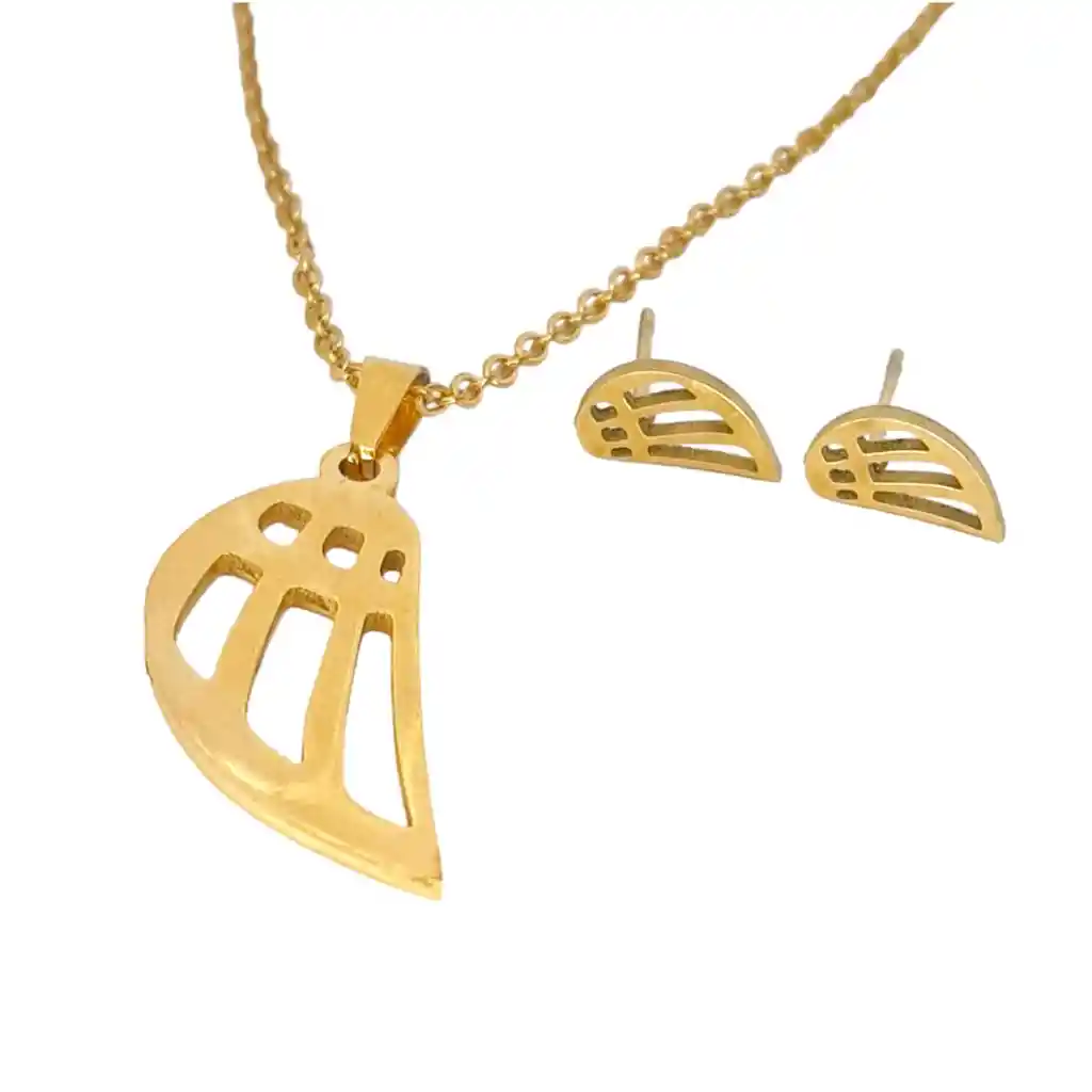 Presentación: Set de Collar y Aretes Material: Acero Quirúrgico Color: Dorado Diseño: Ala Labrada Producto Hipoalergénico. Tamaño: 1 cm Caracteristicas: Es un material que no se oxida, no se oscurece con el tiempo, su tonalidad y brillo no se alteran. Es Antialérgico, la cantidad de níquel que tiene es residual por lo que en rarisimas ocasiones causa alergias. No necesita mantenimiento. Es un material duro, 1000 veces más duro que el platino y no se deforma.