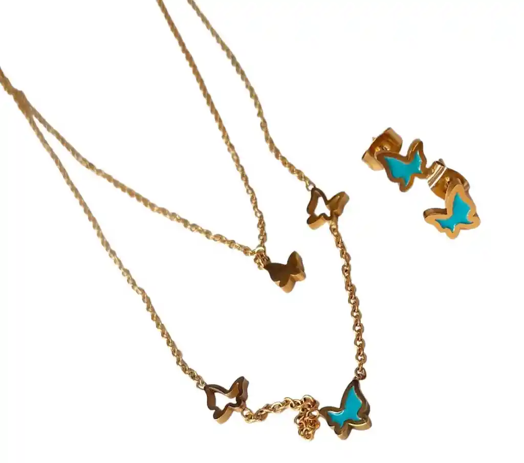 Presentación: Arete Topo (Cierre Mariposa) Material: Acero Quirúrgico Color: Dorado Diseño: Mariposa Azul Producto Hipoalergénico. Tamaño cadena 40 cm Caracteristicas: Es un material que no se oxida, no se oscurece con el tiempo, su tonalidad y brillo no se alteran. Es Antialérgico, la cantidad de níquel que tiene es residual por lo que en rarisimas ocasiones causa alergias. No necesita mantenimiento. Es un material duro, 1000 veces más duro que el platino y no se deforma.
