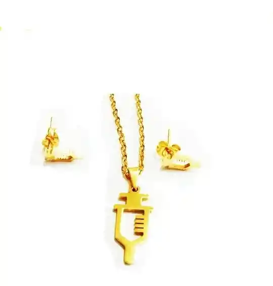 Presentación: Arete Topo (Cierre Mariposa) Material: Acero Quirúrgico Color: Dorada Diseño: Jeringa Producto Hipoalergénico. Cadena de 40 cm Caracteristicas: Es un material que no se oxida, no se oscurece con el tiempo, su tonalidad y brillo no se alteran. Es Antialérgico, la cantidad de níquel que tiene es residual por lo que en rarisimas ocasiones causa alergias. No necesita mantenimiento. Es un material duro, 1000 veces más duro que el platino y no se deforma.