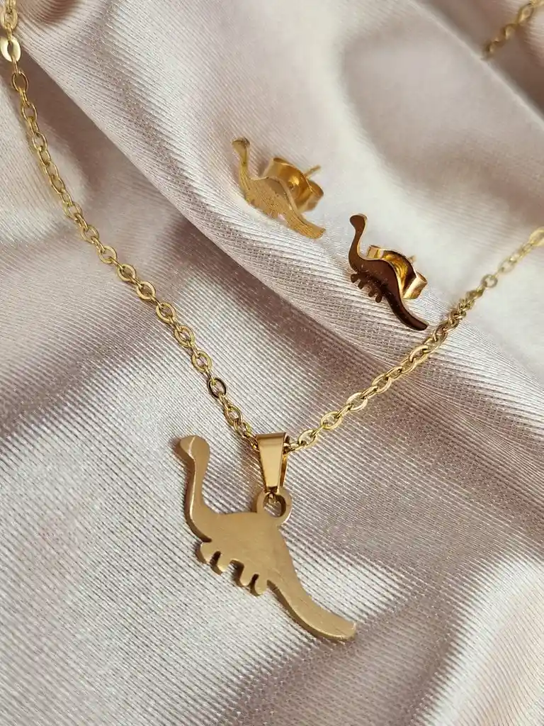 Presentación: Set de Collar y Aretes Material: Acero Quirúrgico Color: Dorado Diseño: Dinosaurio Producto Hipoalergénico. Cadena de 40cm Dije de 1cm Caracteristicas: Es un material que no se oxida, no se oscurece con el tiempo, su tonalidad y brillo no se alteran. Es Antialérgico, la cantidad de níquel que tiene es residual por lo que en rarisimas ocasiones causa alergias. No necesita mantenimiento. Es un material duro, 1000 veces más duro que el platino y no se deforma