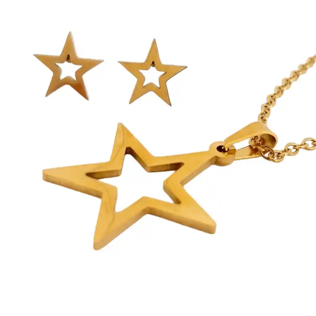 Presentación: Set de Collar y Aretes Material: Acero Quirúrgico Color: Dorado Diseño: Estrella Labrada Producto Hipoalergénico. Tamaño: 1 cm Caracteristicas: Es un material que no se oxida, no se oscurece con el tiempo, su tonalidad y brillo no se alteran. Es Antialérgico, la cantidad de níquel que tiene es residual por lo que en rarisimas ocasiones causa alergias. No necesita mantenimiento. Es un material duro, 1000 veces más duro que el platino y no se deforma.