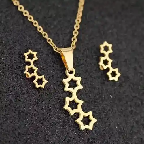 Presentación: Set de Collar y Aretes Material: Acero Quirúrgico Color: Dorado Diseño: Trío Mini Estrellas Producto Hipoalergénico. Tamaño: 60 cm Caracteristicas: Es un material que no se oxida, no se oscurece con el tiempo, su tonalidad y brillo no se alteran. Es Antialérgico, la cantidad de níquel que tiene es residual por lo que en rarisimas ocasiones causa alergias. No necesita mantenimiento. Es un material duro, 1000 veces más duro que el platino y no se deforma.