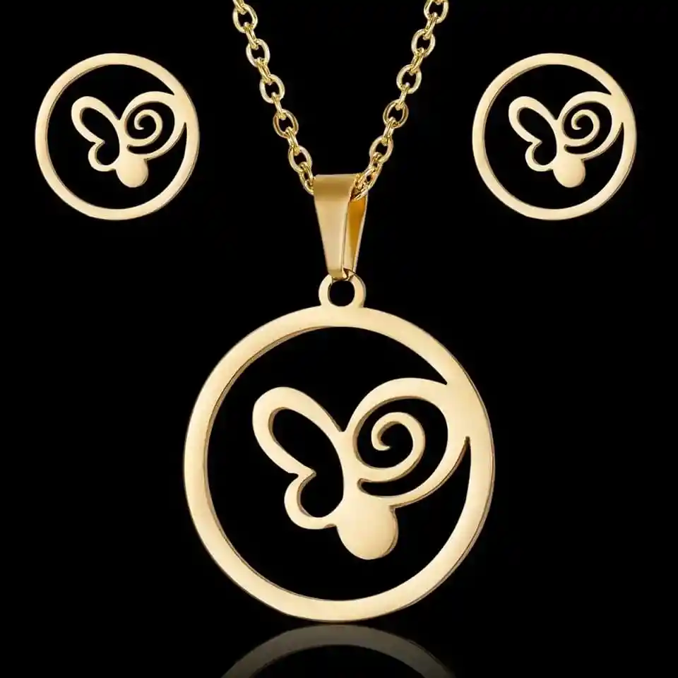 Presentación: Set de Collar y Aretes Material: Acero Quirúrgico Color: Dorado Diseño: Circulo Mariposa Producto Hipoalergénico. Tamaño: 60 cm Caracteristicas: Es un material que no se oxida, no se oscurece con el tiempo, su tonalidad y brillo no se alteran. Es Antialérgico, la cantidad de níquel que tiene es residual por lo que en rarisimas ocasiones causa alergias. No necesita mantenimiento. Es un material duro, 1000 veces más duro que el platino y no se deforma.