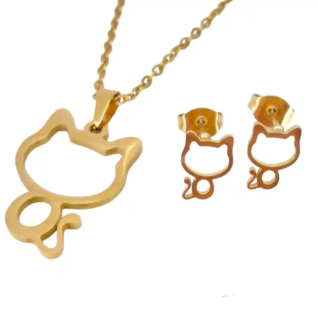 Presentación: Set de Collar y Aretes Material: Acero Quirúrgico Color:Dorado Diseño: Gato con Diseño Producto Hipoalergénico. Cadena de 40cm Caracteristicas: Es un material que no se oxida, no se oscurece con el tiempo, su tonalidad y brillo no se alteran. Es Antialérgico, la cantidad de níquel que tiene es residual por lo que en rarisimas ocasiones causa alergias. No necesita mantenimiento. Es un material duro, 1000 veces más duro que el platino y no se deforma