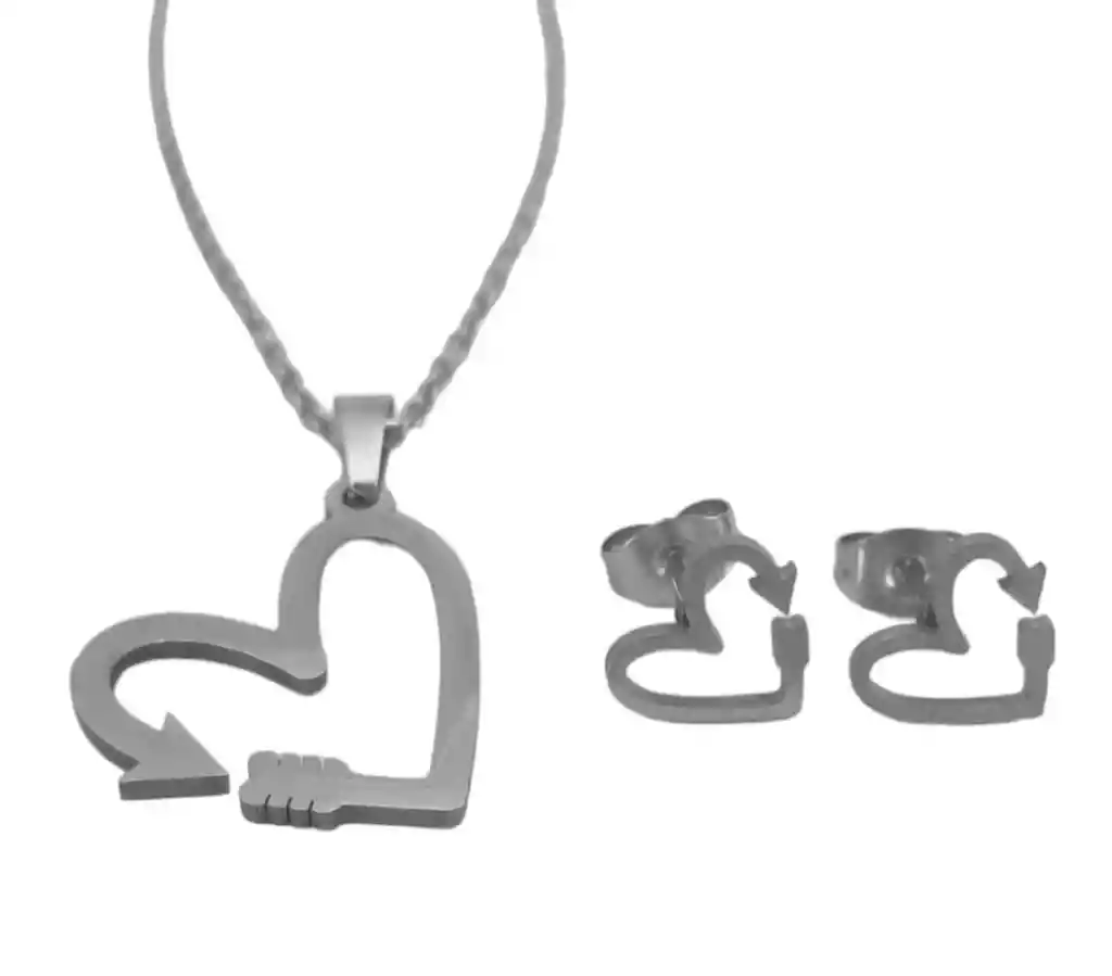 Presentación:Set de Collar y Aretes Material: Acero Quirúrgico Color: Plateado Diseño: Corazón Flecha Producto Hipoalergénico. Cadena de 40cm Dije de 1cm Caracteristicas: Es un material que no se oxida, no se oscurece con el tiempo, su tonalidad y brillo no se alteran. Es Antialérgico, la cantidad de níquel que tiene es residual por lo que en rarisimas ocasiones causa alergias. No necesita mantenimiento. Es un material duro, 1000 veces más duro que el platino y no se deforma