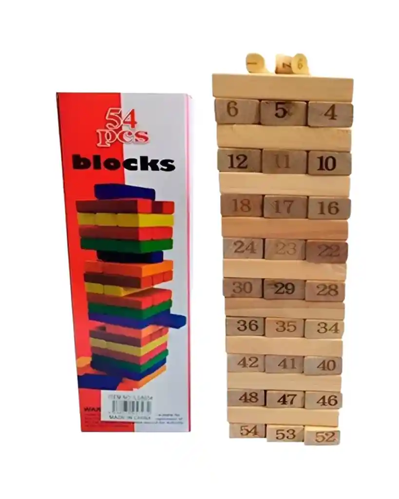 Desafía el pulso y la mente con este clásico juego de bloques apilables! Con 54 piezas numeradas de madera, este set tipo Jenga es ideal para jugar en familia, estimular la coordinación y fomentar el pensamiento estratégico. Cada nivel alterna la orientación de los bloques, creando una torre que pondrá a prueba tu precisión y equilibrio. Beneficios Clave: • 🧠 Estimula la concentración y la lógica: Ideal para desarrollar habilidades de planificación, toma de decisiones y resolución de problemas. • ✋ Mejora la motricidad fina: Retirar y colocar bloques sin derribar la torre fortalece la coordinación ojo-mano. • 🎲 Juego versátil y social: Perfecto para reuniones familiares, fiestas o actividades educativas en grupo. • 🔢 Numeración integrada: Los bloques numerados permiten variantes de juego, como retos matemáticos o dinámicas educativas. • 🌳 Material resistente y seguro: Fabricado en madera natural con bordes suaves; incluye empaque ilustrado y advertencias de seguridad. Detalles del Producto: • Contenido: 54 bloques de madera numerados del 1 al 54 • Presentación: Torre armada + caja ilustrada • Edad recomendada: A partir de 6 años • Dimensiones aproximadas del bloque: [puedo ayudarte a estimarlas si lo necesitas] • Uso: Juego de mesa, terapia ocupacional, dinámicas grupales Este juego no es solo entretenimiento: es una herramienta para aprender jugando, fortalecer vínculos y disfrutar de momentos llenos de emoción y estrategia.