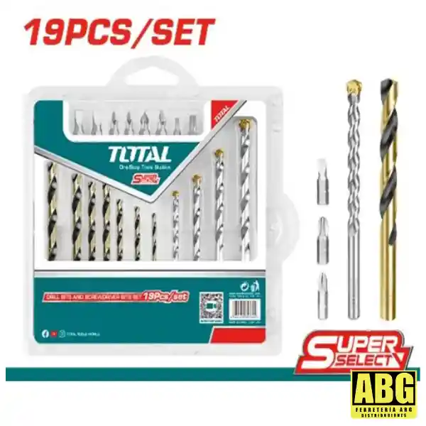JUEGO DE BROCAS PARA LAMINA Y CONCRETO X 19PZS / SUPER SELECT •(7) Brocas para metal: 5/64?, 7/64?, 1/8?, 5/32?, 3/16?, 7/32?. •(4) Brocas para concreto: 5/32?, 3/16?, 1/4?, 5/16?. •(8) puntas de destornillador de 25 mm: SL4.5; L5.5; PH1; PH2; PZ1; PZ2; T20; T30.