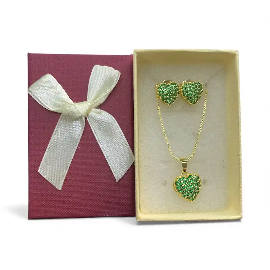 Juego De Cadena Con Aretes Tipo Topo Dorado Con Piedras Verdes Diseño De Corazon