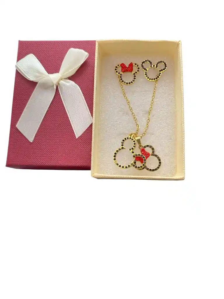 JUEGO DE CADENA, DIJE Y ARETES DISEÑO DE MINNIE Y MICKEY MOUSE CON PIEDRAS NEGRAS Y ROJAS EN ACERO