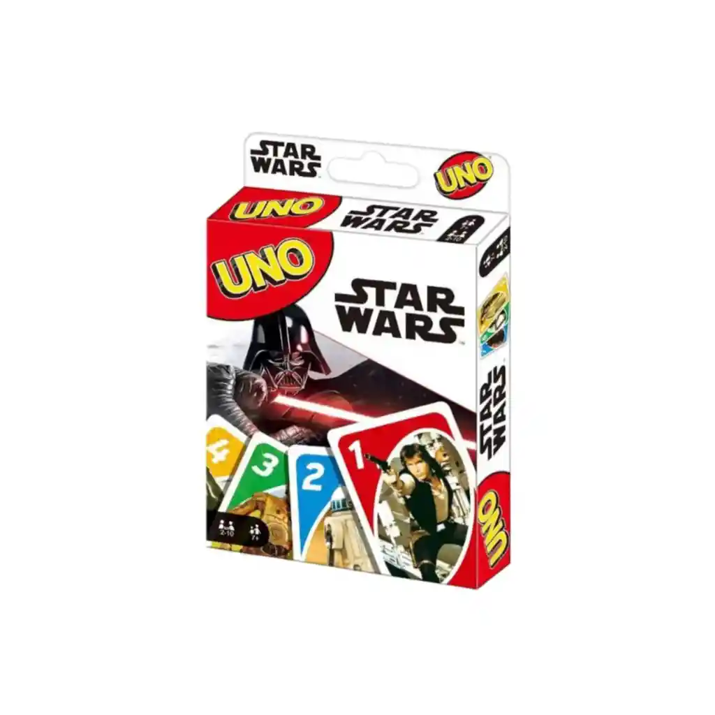 ⭐🃏 Juego de Cartas UNO Star Wars – Card Game Para Niños ¡La emoción de UNO se une al universo épico de Star Wars! El Juego de Cartas UNO Star Wars es perfecto para disfrutar en familia o con amigos, llevando las partidas clásicas a otra galaxia. Con ilustraciones increíbles de tus personajes favoritos, como Luke Skywalker, Darth Vader y Yoda, es ideal para fans pequeños y grandes de la saga intergaláctica. ⭐ Características destacadas: Edición especial Star Wars: Cartas ilustradas con personajes y escenas icónicas. Reglas clásicas de UNO, fáciles de aprender para niños y adultos. Incluye cartas especiales que aportan más estrategia y diversión. Ideal para 2 a 10 jugadores. Recomendado para edades 7 años en adelante. Perfecto para reuniones familiares, fiestas o como regalo para fans de Star Wars. Producto original Mattel (según disponibilidad).