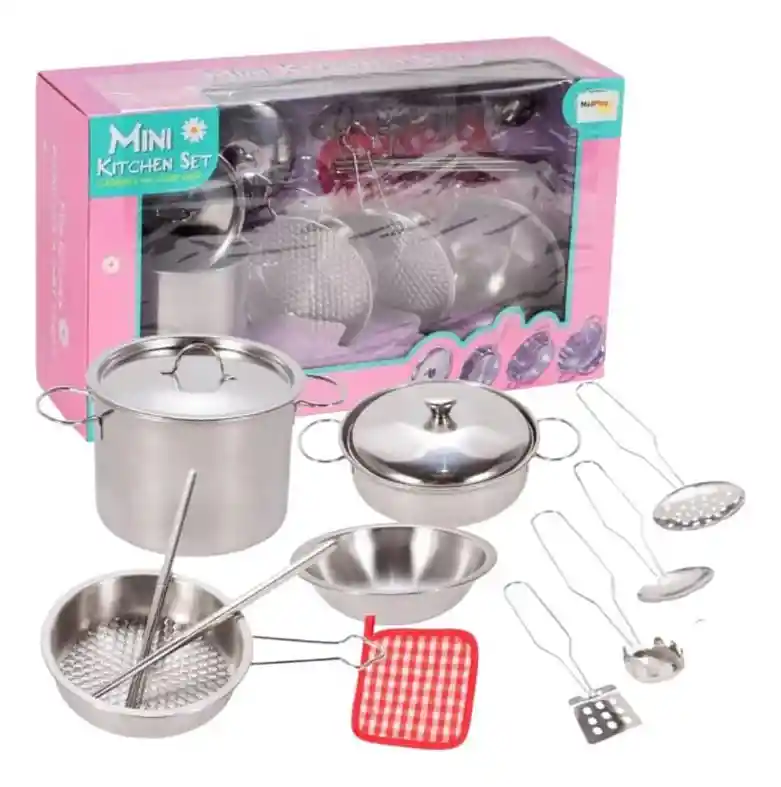 El set incluye todo lo que necesita un pequeño o pequeña chef. Material alta calidad Este gran juego de ollas y accesorios es muy útil en la cocina casera de cada pequeño chef. Perfecto para jugar a preparar la cena para todos los que te rodean. El juego de cocina le proporcionará una gran diversión además de aprender a cocinar y le permitirá desarrollar aún más sus intereses. El producto aumenta la creatividad. el desarrollo motor y brinda mucha alegría con muchas horas de diversión. Al jugar con sus compañeros, enseña la cooperación. Las ollas y accesorios tienen un color metálico para combinar con cualquier cocina.