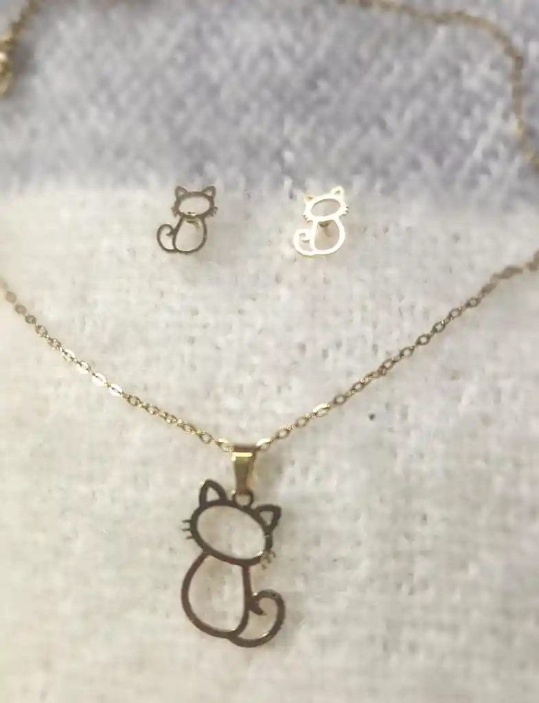 Juego De Collar Y Aretes De Acero Inoxidable - Forma De Gato