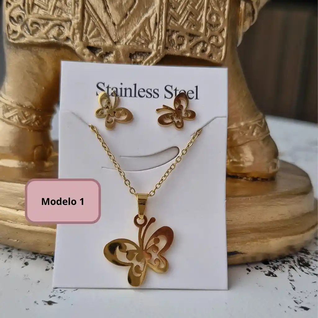 Juego De Collar Y Aretes En Acero Dorado Mariposa Presentación: Set de Collar y Aretes Material: Acero Color: Dorado Diseño: Mariposa Medidas: Cadena de 40cm Dije: 1.5 cm Aretes de topito mariposa: 1 cm Importante: Tenemos 3 modelos, en cuanto hagas tu orden escríbenos para indicar que diseño deseas en caso de que esto no suceda te enviaremos un modelo al azar. Características: Hipoalergénico El acero es un material que no se oxida No se oscurece con el tiempo, su tonalidad y brillo no se alteran No necesita mantenimiento Se recomienda no aplicar perfume directamente