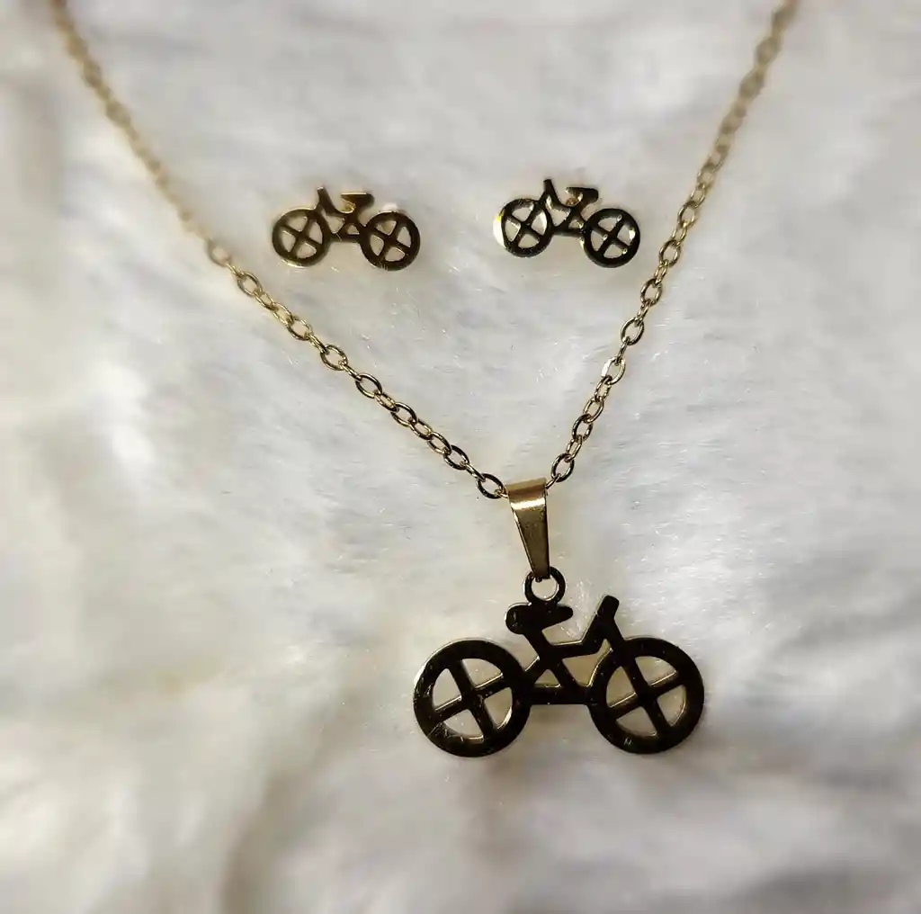 JUEGO DE COLLAR Y ARETES, EN ACERO INOXIDABLE - FORMA DE BILICLETA