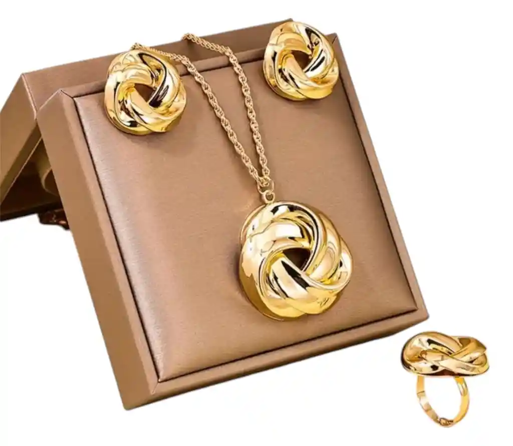 Juego de Collar Y Aretes Para Mujer Diseño Nudos Descubre el juego de collar y aretes para mujer, una exquisita opción que combina elegancia y diseño moderno. Este set destaca por su cautivador diseño de nudos, que aporta un toque distintivo y sofisticado a cualquier atuendo. Cada pieza, elaborada en aleación de alta calidad, garantiza durabilidad y confort, convirtiéndose en un accesorio ideal para diversas ocasiones. El juego contiene: 1 par aretes de 2cm 1 collar 1 anillo ajustable Recomendaciones: No aplicar cremas, ni perfumes, ni mojar. Se envía en estuche