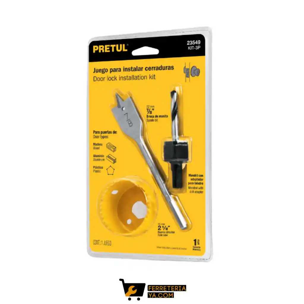 Juego de 3 piezas para instalar cerraduras, Pretul. Brocasierras de acero al carbono Incluye Brocasierra 2 1/8" Mandril de 3/8" Broca de manita 7/8"