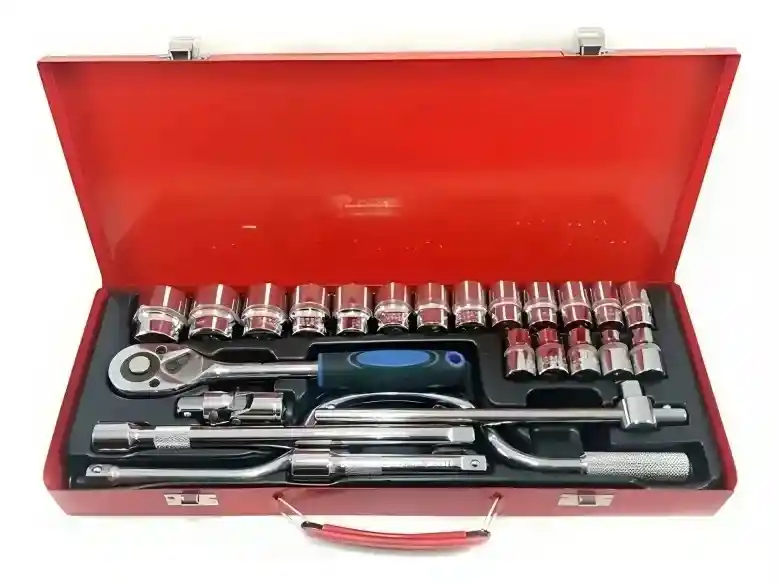 Juego de Copas x 24 piezas cuadrante de 1/2 Copas desde 8-32 Mm Material de fabricación: Acero Cromo vanadium. Incluye 24 piezas: *18 copas milimétricas hexagonales: 10mm-11mm-12mm-13mm-14mm-15mm-16mm-17mm-18mm-19mm-20mm-21mm-22mm-23mm-24mm-27mm-30mm-32mm *1 ratchet de fuerza *1 Barra corrediza *1 Envolvedor *2 extensores: 5 pulgadas y 3 pulgadas *1 Unión universal (borracho) Caja metálica de trasport