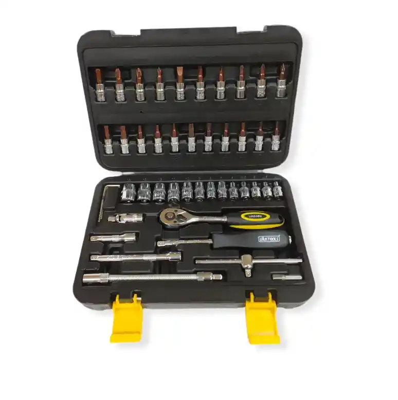 JUEGO DE COPAS CUADRANTE DE 1/4" X 46 pc Kit de herramientas en Acero Forjado Cromo Vanadium adecuado para linea automotriz, reparación de maquinarias. CARACTERISTICAS Contenido: • Dados 1/4" = ° de 7-8-9-10-11-12-13-14 mm ° 4-4.5-5-5.5-6 mm ° Copa Punta Recta FD4-FD5.5-FD7 ° Copa Punta Estrella T10-T15-T20-T25-T30-T40 ° Punta HW3-HW4-HW5-HW6 ° Junta Universal ° Llaves Allen 1.5-2-2.5 mm ° Mango Tipo Destornillador ° Mango en T ° 2 Extensiones ° Rachet ° Caja Plástica • Marca UYUSTOOLS • Procedencia TAIWAN