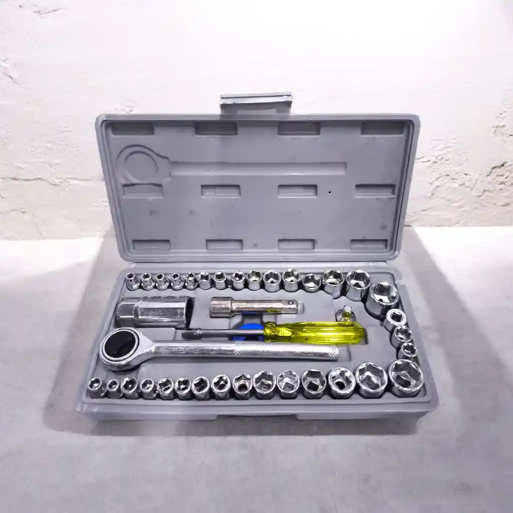 Juego de Copas y Ratchet Profesional – Set Completo Multiusos Si buscas un kit práctico, completo y resistente para el hogar, moto o carro… ¡este es el indicado! 💪 Un estuche compacto que trae TODO lo necesario para trabajos de mecánica básica y mantenimiento. 🧰 ¿Qué incluye el set? 🔩 Juego completo de 40 piezas aprox. (puede variar levemente según lote) ✔ 1 Llave Ratchet (trinquete) reversible Sistema de giro suave Cambio de dirección Mango antideslizante ✔ 1 Extensión Para alcanzar tornillos en espacios profundos ✔ 1 Adaptador universal ✔ 1 Copa para bujía ✔ Juego de copas métricas pequeñas (Desde 4mm hasta 13mm aprox.) ✔ Juego de copas medianas y grandes (Desde 14mm hasta 24mm aprox.) (Incluye variedad de medidas para cubrir la mayoría de trabajos domésticos y automotrices básicos.) 📏 Medidas del estuche: Largo: 28 – 30 cm Ancho: 14 – 16 cm Alto: 4 – 5 cm Compacto, fácil de guardar en carro, moto o caja de herramientas. 🛠 Material: Acero cromado resistente Alta durabilidad Resistente a la corrosión 🚗 Ideal para: 🔹 Reparaciones en el hogar 🔹 Mantenimiento de moto 🔹 Ajustes en carro 🔹 Trabajos mecánicos básicos 🔹 Tener en el carro para emergencias