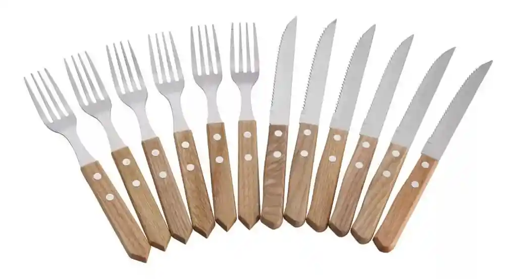 Domina la parrilla con estilo con nuestro juego de cubiertos BBQ! 6 tenedores y 6 cuchillos en acero inoxidable con mango de madera barnizada con remaches que harán de cada asado o de cada comida una experiencia excepcional. ¡Haz que tus asados resalten con nuestro juego de cubiertos! Especial para los amantes de la parrilla. Juego de cubiertos BBQ UNIVERSAL