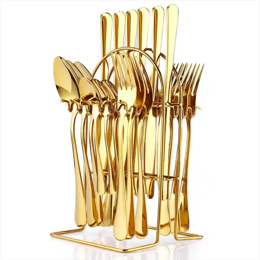 Descubre la elegancia en cada comida con nuestro juego de cubiertos por 24 piezas color dorado! Si estás buscando llevar la presentación de tus comidas a un nuevo nivel te ofrecemos la combinación perfecta entre estilo, durabilidad y funcionalidad. Calidad premium: Fabricado con acero inoxidable de primera calidad, nuestro juego de cubiertos garantiza resistencia para años de uso. Diseño elegante: Con un diseño moderno y sofisticado, cada pieza está cuidadosamente diseñada para agregar un toque de elegancia a tu mesa. 24 piezas completas: Este completo juego incluye todo lo que necesitas para servir a tu familia y amigos, desde cucharas y tenedores hasta cuchillos y cucharillas de postre. Versatilidad y practicidad: Apto para lavavajillas, este juego de cubiertos es fácil de limpiar, lo que lo hace perfecto para el uso diario o para ocasiones especiales. CARACTERISTICAS. Material: Acero inoxidable. Color: Dorado. Mango: Cómodo. Peso: Ligero. Bordes: Lisos. Ideal para niños y adultos. Cuenta con los siguientes cubiertos: - 6 cucharas sopa. - 6 tenedores. - 6 cuchillos. - 6 cucharillas de postre. - Incluye soporte.