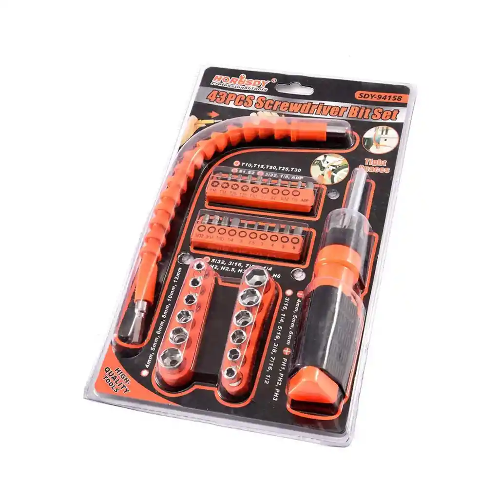 Características: 1 x Destornillador de puntas 1 x Extensión flexible 21 x Misc. Puntas T10, T15, T20, T25, T30 Planas: S1, S2 Hexagonal imperial: 3/32, 1/8, 5/32, 3/16, 7/32, 1/4″ Hexagonal métrica: 2 , 2,5, 3, 4, 5, 6 mm Adaptador 12 x Dados: Imperial: 3/16, 1/4, 5/16, 3/8, 7/16, 1/2″ Métrico: 4, 5, 6, 8, 10, 12 mm 6 puntas de destornillador Planas: 4, 5, 6 mm Phillips: PH1, PH2, PH3