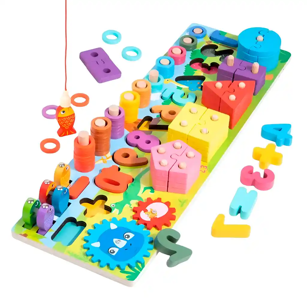 Convierte el tiempo de juego en una increíble aventura de descubrimiento con nuestra Mega Tabla de Actividades Montessori de Madera. Este impresionante centro de aprendizaje todo-en-uno está repleto de diversión educativa: tu pequeño podrá encajar los números del 1 al 10, apilar los anillos de conteo, resolver rompecabezas de formas geométricas, disfrutar de un entretenido juego de pesca magnético y hacer girar los simpáticos engranajes de dinosaurio. Cada elemento está cuidadosamente diseñado para ofrecer una experiencia de aprendizaje integral, promoviendo habilidades matemáticas tempranas, desarrollando la motricidad fina, mejorando la coordinación mano-ojo y fomentando la resolución de problemas. Fabricado en madera de alta calidad con pinturas no tóxicas y bordes lisos, es el regalo educativo definitivo que mantendrá a tu hijo felizmente ocupado durante horas, creciendo con sus habilidades y sentando las bases para un amor por el aprendizaje que durará toda la vida. Ficha Técnica: Dimensiones del producto: 44 cm x 13 cm x 4 cm Material: Madera Edad Apta : + 3 Años Certificado de conformidad: SL-CS-210043 Referencia: DM1285 ** _Para defectos de fábrica o retractos: \_Por favor revise el producto apenas lo reciba y antes de usarlo. No aplican ley de retracto o defectos de fábrica luego de usar el producto. Se manejan máximo 5 días para reportar defectos de fábrica (por ejemplo, producto funciona mal, piezas faltantes, rotas, etc). Para hacer efectiva la devolución el producto debe devolverse con el empaque original, el cual debe estar en buen estado, incluir todos los documentos y las partes completas y sin daños.
