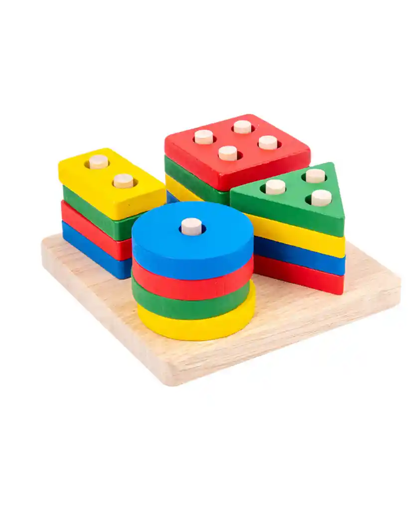 Características principales: Material: madera resistente con pintura no tóxica. Incluye: base con clavijas y 4 bloques de diferentes formas y colores (círculo, triángulo, cuadrado y rectángulo). Aprendizaje divertido: los niños pueden apilar, clasificar y encajar las piezas, desarrollando motricidad fina, coordinación mano-ojo y reconocimiento de colores y formas. 🎁 Ideal para: Estimulación temprana en casa o jardín infantil. Actividades de tipo Montessori.