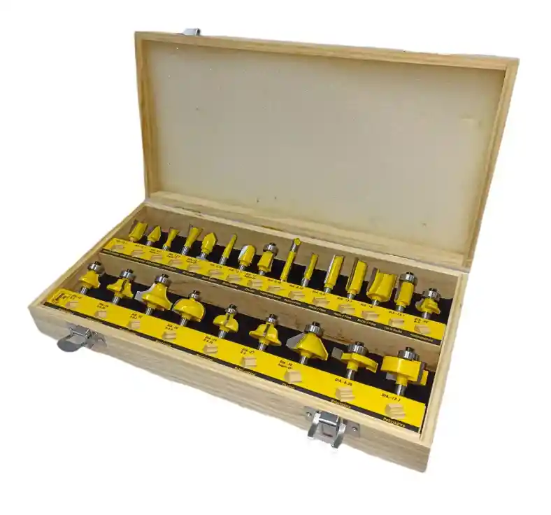 Para madera de 24 piezas. Ideal para FRESADORA. Modelo: CQT024 Diámetro de vástago: 6.3mm Contiene: 1 llave allen de 2mm 24 fresas de diferentes formatos Tipos de frezas: 3 fresas para ranurar (Diámetro 12.7mm) 1 fresa para cola de milano (Diámetro 9.5mm ANGULO-14º) 1 fresa para cola de milano (Diámetro 12.7mm ANGULO-14º) 1 fresa para ranura en V (Diámetro 12.7mm ANGULO 90º) 1 fresa para media caña (Diámetro 6.35mm) 1 fresa para media caña (Diámetro 12.7mm) 1 fresa para biselar con guía (Diámetro 17mm ANGULO 25º) 1 fresa copiadora (Diámetro 6.35mm) 1 fresa para ranurar (Diámetro 6.35mm) 1 fresa para ranurar (Diámetro 9.5mm) 1 fresa para ranurar (Diámetro 19mm) 1 fresa de enrasar y biselar con guía (Diámetro 12.7mm) 1 fresa para redondear con guía (Diámetro 20mm R3) 1 fresa para redondear con guía (Diámetro 22mm R5) 1 fresa para redondear con guía (Diámetro 25mm R6.35) 1 fresa para redondear con guía (Diámetro 32mm R9.5) 1 fresa para media caña con guía (Diámetro 29mm R9.5) 1 fresa para media caña con guía (Diámetro 22mm R6.35) 1 fresa para perfilar con guía (Diámetro 27mm R-4) 1 fresa para perfilar con guía (Diámetro 30mm Angulo 45º) 1 fresa de disco para ranurar con guía (Diámetro 6.35mm) 1 fresa de disco para ranurar con guía (Diámetro 12.7mm) Presentación: En caja de madera con organizador,