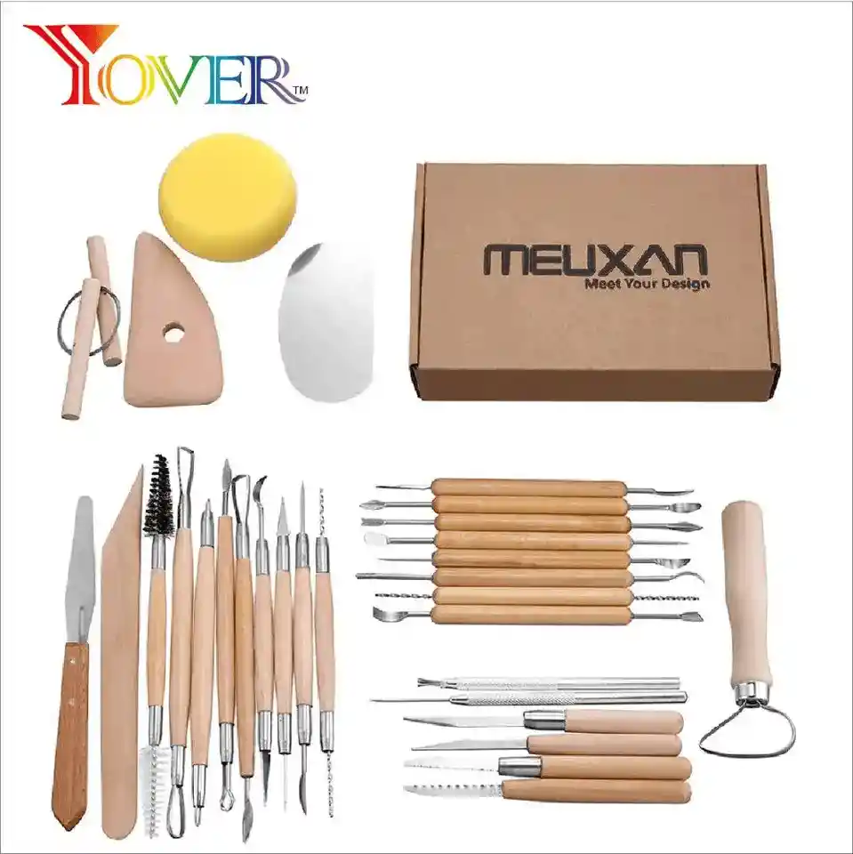 Juego de herramientas para esculpir herramientas de arcilla de herramientas de cerámica de 30 piezas Tamaño de la unidad : 22x15x2.5cm MOQ : 1 juego Paquete de unidad : Caja de cartón corrugado con envoltura retráctil logotipo : Logotipo personalizado en la caja Peso de la unidad : 0,4 kg uso : Uso de arcilla y escultura. Color : Color de madera natural. Característica : Materia prima de alta calidad, no tóxica Certificación : ASTM D-4236, MDSD, ASTM F-963, LHAMA