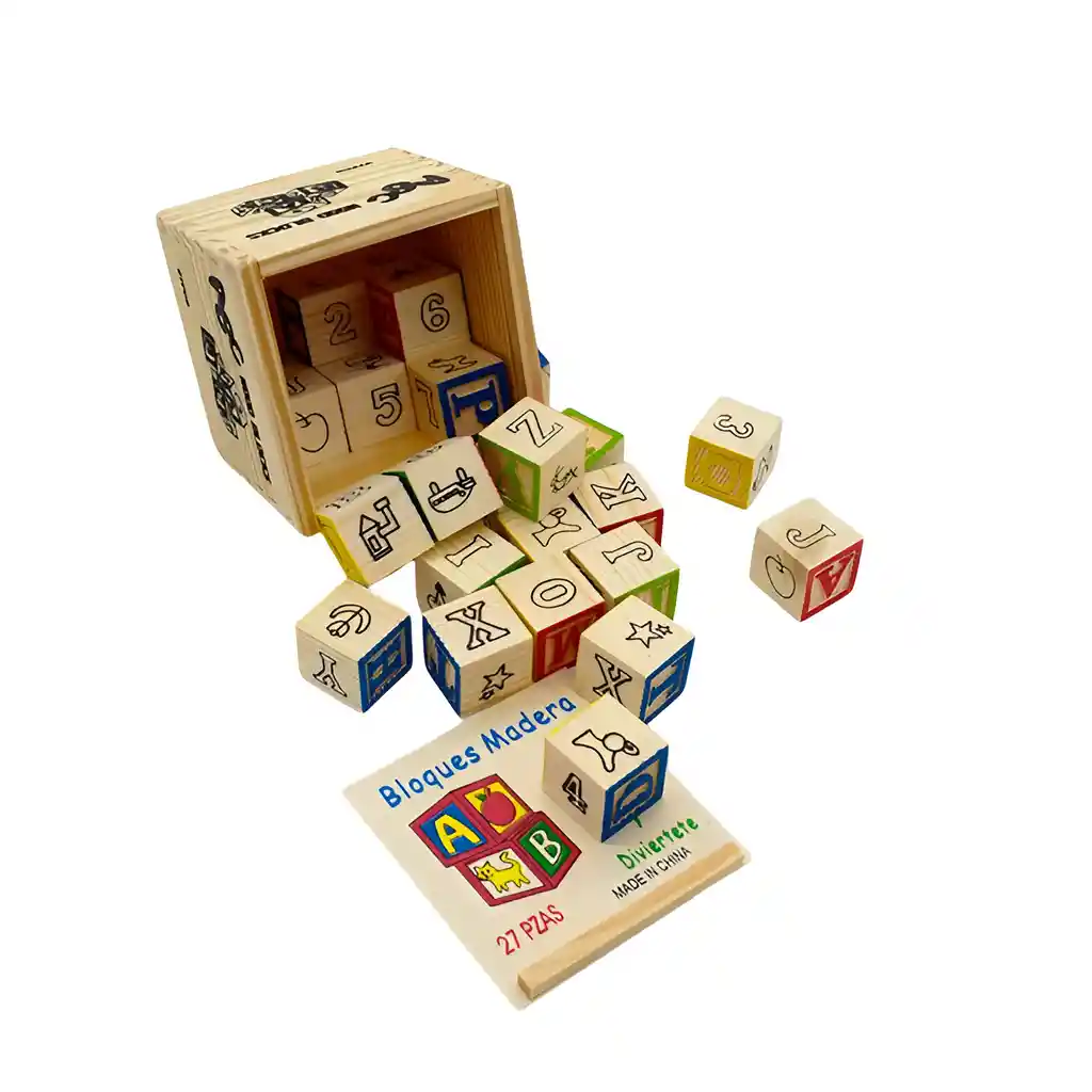 Construye las bases del aprendizaje y la creatividad con nuestro clásico set de 27 bloques de madera, el juguete educativo que nunca pasa de moda. Cada bloque, fabricado en madera pulida de alta calidad, es un tesoro de descubrimiento, presentando en sus caras letras del abecedario, números y encantadoras ilustraciones que fomentan la asociación de palabras. Mientras tu pequeño apila, construye y derriba, no solo estará desarrollando su motricidad fina y coordinación, sino también familiarizándose con los fundamentos de la lectura y las matemáticas de una manera táctil y divertida. El set incluye una práctica caja de almacenamiento de madera para mantener todo organizado, convirtiéndolo en el regalo perfecto y duradero que ofrece infinitas posibilidades para el juego imaginativo y el aprendizaje temprano. ¡Es la herramienta esencial para inspirar a tu pequeño constructor! Ficha Técnica: Dimensiones del producto: 10.5 cm x 10.5 cm x 10.5 cm Material: Madera Edad Apta : + 3 Años Certificado de conformidad: SL-CS-210043 Referencia: DM539 ** _Para defectos de fábrica o retractos: \_Por favor revise el producto apenas lo reciba y antes de usarlo. No aplican ley de retracto o defectos de fábrica luego de usar el producto. Se manejan máximo 5 días para reportar defectos de fábrica (por ejemplo, producto funciona mal, piezas faltantes, rotas, etc). Para hacer efectiva la devolución el producto debe devolverse con el empaque original, el cual debe estar en buen estado, incluir todos los documentos y las partes completas y sin daños.