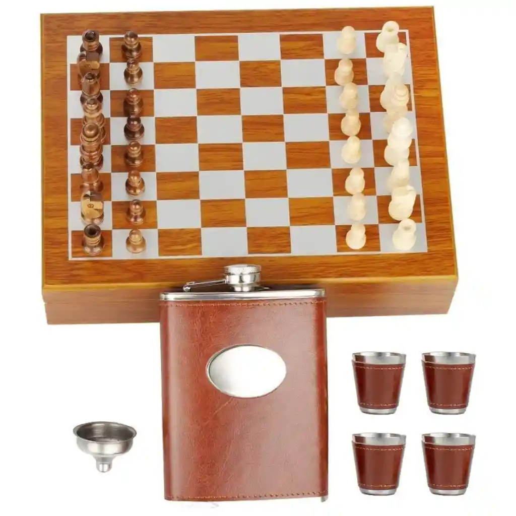 Ajedrez QT33 Premium – Tablero de Colección con Accesorios de Lujo El Ajedrez QT33 Premium Edition es un set que rinde homenaje al estilo clásico del ajedrez tradicional, combinando madera artesanal, accesorios metálicos y diseño elegante. Su presentación en caja de madera con cierre magnético y compartimentos ocultos lo convierte en una pieza única de colección. Detalles del producto: El tablero superior está fabricado en madera de alta densidad, con acabados suaves y tonos contrastantes. Las piezas, torneadas con precisión, ofrecen un agarre cómodo y estable. En su interior, el compartimento de espuma moldeada alberga un kit metálico de accesorios de lujo, entre los que se incluyen una petaca forrada en cuero sintético, una pipa decorativa, un embudo y un frasco de acero inoxidable. Especificaciones técnicas: Material general: Madera y acero inoxidable. Medidas: 27 cm largo x 27 cm ancho x 8 cm alto. Peso total: 1.3 kg. Color: Marrón oscuro con acabado brillante. Contenido: Tablero superior de ajedrez con 32 piezas completas. Compartimento inferior con espuma moldeada. Petaca + frasco metálico + embudo + pipa decorativa. Cierre: Magnético invisible. Tipo de uso: Decorativo, recreativo y de colección. Beneficios adicionales: Ideal para oficinas, hogares o regalos conmemorativos. Diseño refinado y materiales duraderos. Presentación elegante para obsequios. Garantía: 30 días por defectos de fábrica. No cubre daños ocasionados por líquidos, golpes o exposición prolongada al sol.