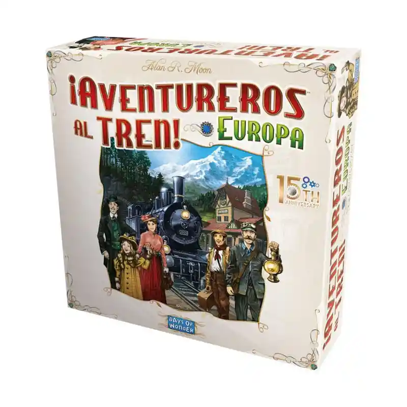 "Aventureros al Tren Europa 15 Aniversario es un juego de mesa que nos presenta una auténtica edición de lujo para celebrar los primeros 15 años de este magnífico juego familiar de gestión de rutas ferroviarias. Desde los pies del Big Ben de Londres hasta los altísimos arcos del Coliseo de Roma, desde las brillantes cúpulas redondeadas de Moscú hasta la esbelta Torre Eiffel en París, Aventureros al Tren: Europa lleva a los jugadores a vivir inolvidables aventuras en tren a través de las grandes ciudades de la Europa de fin de siglo. Aventureros al tren Europa 15 Aniversario es una versión actualizada de la versión de 2005 que incluirá nuevas ilustraciones, así como diseños renovados de los trenes y las estaciones. Los nuevos trenes y estaciones vendrán en cajas de lata, junto con un nuevo tablero de juego y billetes de destino actualizados. Según el diseñador del juego, Alan R. Moon, la Edición 15º Aniversario será más grande que su versión original. Con sus trenes y estaciones de plástico a los que no les falta ni un detalle y sus preciosas cajas de hojalata, esta edición se ha mejorado con un diseño artístico completamente nuevo y se ha ampliado incluyendo todos los Billetes de Destino editados hasta la fecha. Los jugadores roban o juegan cartas de tren para colocar sus piezas de colores en el tablero de juego, y las piezas representan las redes de transporte en crecimiento que los jugadores deben construir para ganar puntos. En el Aventureros al tren Europa original, de dos a cinco jugadores compiten por conectar el mayor número de ciudades que aparecen en sus cartas de billete, y los jugadores construyen vías a lo largo de todo un continente. Rango de edad : 8+ Contenido de la caja }: , 5 cajas de metal, cada una con 45 vagones de vagón esculpidos, 15 estaciones de tren de colores, 5 marcadores de puntuación, 1 folleto de reglas, 110 tarjetas de vagón de tren, las 108 tarjetas de Billetes de Destino, 1 Carta del European Express y 1 Carta de Referencia de Grandes Ciudades. Incluye 1 mapa de tablero gigante de las rutas de trenes europeas con ilustraciones nuevas."
