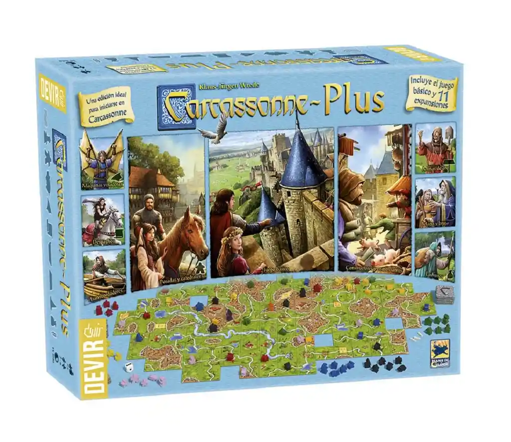 CARCASSONNE PLUS Calificación BGG: 8.1 Carcassonne es un juego de colocación de losetas, compitiendo por ser el que más puntaje obtenga, completando caminos, castillos, monasterios y granjas. En cada turno debes ubicar una loseta, que tomas al azar de forma oculta, y la debes ubicar en el tablero para que coincida con lo que está en juego, por lo que el tablero del juego siempre será diferente y dependiendo de tu estrategia debes saber ubicar tu loseta, ya que la forma en que la pongas definirá a qué podrás acceder, puntuar o bloquear a los demás. Modo de Juego: Competitivo Número de jugadores: 2 a 6 Edad: 7+ Tiempo de juego: 35 minutos o más. En esta gran caja, encontrarás el juego básico y las siguientes expansiones, algunas de ellas, solo disponible en esta caja: - Posadas y Catedrales. - Constructores y Comerciantes. - El abad. - El Río. - Máquinas Voladoras. - Transbordadores. - Despachados. - Minas de Oro. - Mago y Bruja. - Ladrones. - Círculos en los cultivos.
