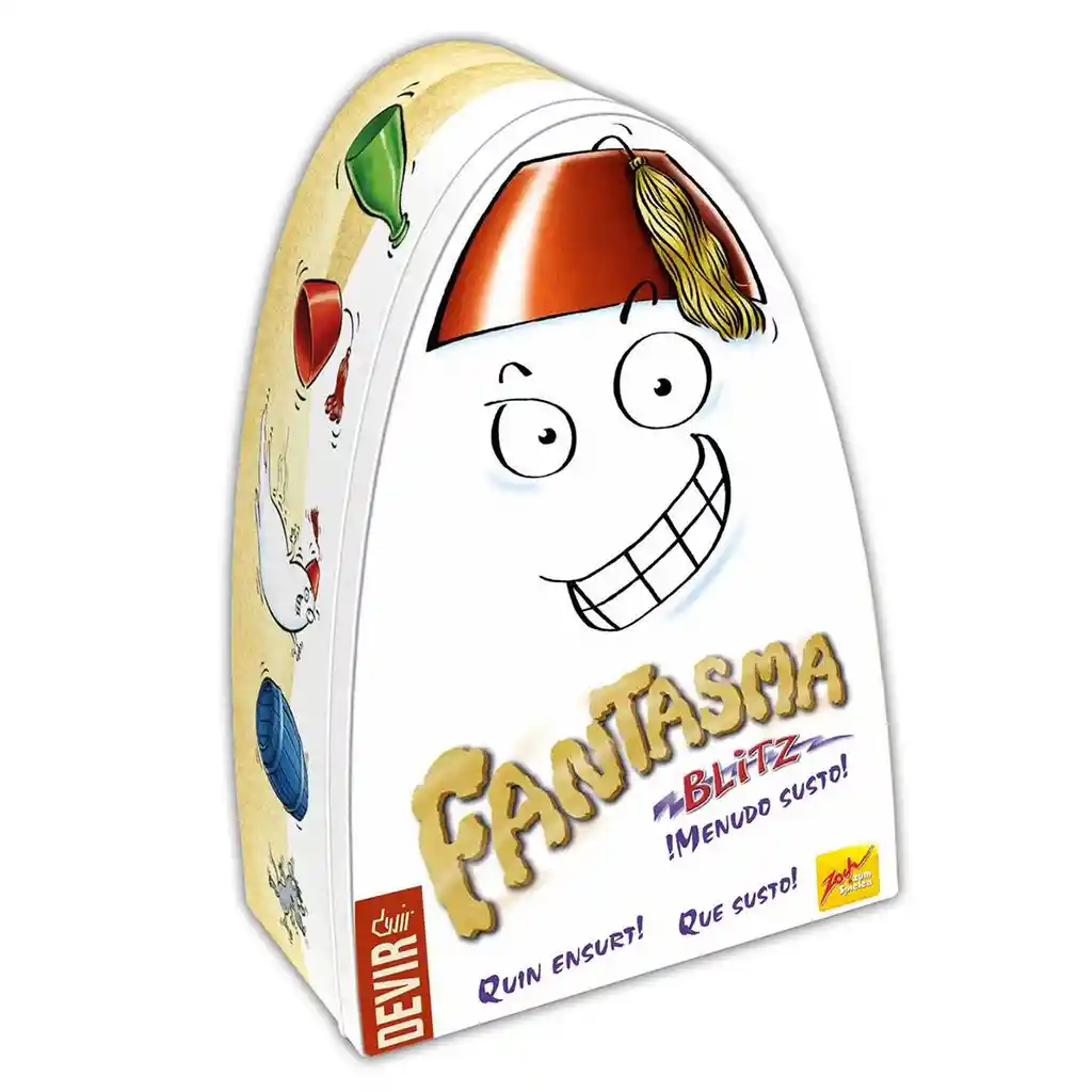 Fantasma Blitz ¡Menudo Susto! Clasificación BGG: 6.8 Fantasma Blitz, menudo susto, es la una incorporación a la familia de juegos de rompecabezas de Zoch. Viene en una hermosa caja de metal y presenta dos artículos nuevos, el barril y el gorro. Si bien las reglas básicas aún se aplican, el gorro se puede colocar sobre cualquiera de los otros elementos. Es un nuevo desafío saber qué elemento se esconde debajo del gorro en todo momento. El veloz juego de reconocimiento de formas y colores que seguramente pondrá a prueba los reflejos de los niños, las familias y los jugadores por igual. Cinco artículos se ponen en la mesa esperando ser atrapados. Cada carta de la baraja muestra imágenes de dos objetos, con uno o ambos objetos coloreados de manera incorrecta. Con todos los jugadores jugando al mismo tiempo, alguien revela una carta, luego los jugadores toman el objeto "correcto", pero ¿cuál es el objeto correcto? Si un objeto tiene el color correcto, por ejemplo, una botella verde y un ratón rojo, los jugadores deben agarrar ese objeto con el color correcto. Si ambos objetos tienen un color incorrecto, por ejemplo, un fantasma verde y un ratón rojo, entonces debes buscar el objeto y el color que no están representados entre los cuatro detalles que se muestran. En este caso, verás verde, rojo, fantasma y ratón, por lo que los jugadores deben agarrar el barril azul. El primer jugador que agarra el objeto correcto se queda con la carta y luego revela la siguiente carta del mazo. Si un jugador agarra el objeto equivocado, debe descartar una carta recolectada previamente. Una vez que se acaba el mazo de cartas, el juego termina y ¡gana el que haya recogido más cartas! La nueva característica clave ahora es el Gorro, que usa para cubrir uno de los otros elementos. Cuando los jugadores están obligados a atrapar el gorro, en su lugar dicen el nombre de un elemento debajo del gorro. Cuando los jugadores están obligados a atrapar el artículo debajo del gorro, en su lugar, atrapan el gorro para mostrar el artículo que estaba cubierto. Cada vez que se atrapa gorro, el jugador que lo sostiene puede cubrir el mismo elemento o uno nuevo. Contenido del Juego - 1 Sombrero - 4 Objetos (fantasma blanco, botella verde, barril azul, ratón gris) - 60 cartas - 1 manual de reglas Cantidad de jugadores: 2- 8 Jugadores Tiempo para jugar: 20 minutos Edad:8+