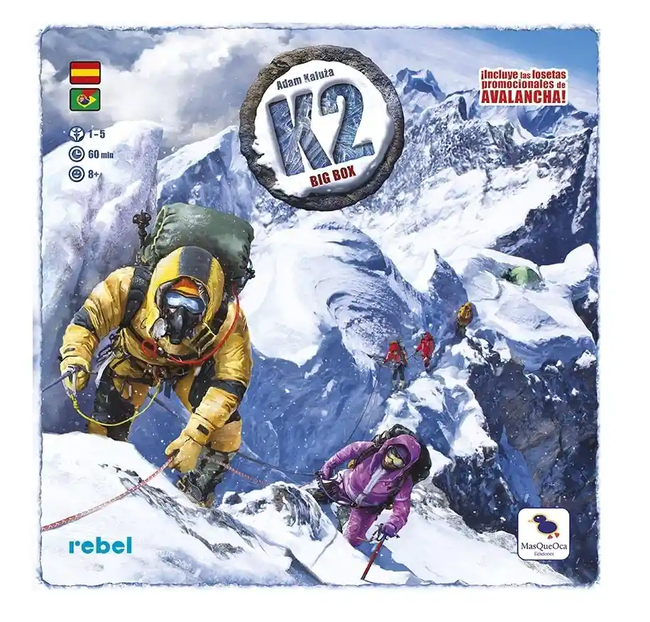 Juego de Mesa K2: BIG BOX Calificación BGG: 7.7 El K2 es la segunda montaña más alta de la Tierra, así como la segunda más mortífera. Se le conoce como la Montaña Salvaje, ya que mata a una persona por cada cuatro que alcanzan la cima... Ahora tu equipo se encuentra a su sombra, listo para escalar hacia la fama y la gloria. K2 es un juego de mesa en el que cada jugador controla un equipo de dos alpinistas, intentando alcanzar la cima del K2 y regresar antes que los demás equipos y antes de que la montaña los aniquile. Cada jugador usa una baraja de cartas idéntica. Usas las cartas para mover a tus escaladores por la ruta indicada en el tablero o para aclimatar a los miembros de tu equipo. También puedes montar una tienda de campaña y esperar a que mejore el tiempo. Tendrás que elegir tu camino con cuidado, ya que los demás alpinistas pueden bloquearte el paso y estar atento al tiempo que se aproxima, lo que puede reducir tu aclimatación a cero y, por lo tanto, matar a tus escaladores. La temática está muy bien representada por la mecánica, incluyendo elementos como el cambio de tiempo, la falta de oxígeno y la muerte de los alpinistas. El resultado es una partida emocionante tanto para jugadores como para no jugadores. • Tipo de juego: competitivo • Edad: 8 años en adelante • Número de Jugadores: 1 a 5 jugadores • Tiempo de Juego: 60 minutos • Dificultad (1-5): 2.19 • Idioma: Español CONTENIDO DE LA CAJA • 1 tablero a doble cara. • 12 losetas de clima. • 1 marcador de clima. • 1 marcador de jugador inicial. • 10 tiendas de campaña. • 20 alpinistas. • 5 tableros de jugador. • 10 marcadores de aclimatación. • 90 cartas de juego. • 5 cartas de rescate. • 20 fichas de riesgo. • 1 reglamento. BROAD PEAK • 1 tablero a doble cara. • 12 fichas de cavidad en la nieve. • 30 fichas de puntos de victoria. • 20 fichas de travesía. LHOTSE • 1 tablero a doble cara. • 10 losetas de clima. • 10 fichas de cuerda fija. • Promo Avalancha - 4 losetas de clima. Recuerda, somos TIENDA MOVITEC