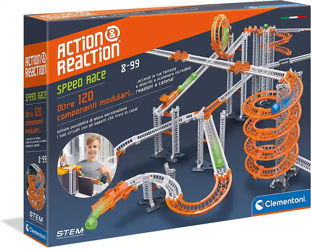 Empaque de regalo sin costo adicional, escríbenos al finalizar la compra. 8 años + Con el juego de construcción "Speed Race: Acción y Reacción", los niños pueden aprender sobre los conceptos físicos de movimiento, velocidad y acción y reacción mientras se divierten construyendo pistas cada vez más complejas y espectaculares. Este juego inteligente e ingenioso está diseñado para niños, pero también es atractivo para adultos, por lo que es una actividad perfecta para disfrutar en familia. El juego cuenta con más de 120 componentes modulares que se pueden conectar entre sí, sin necesidad de imanes, para crear pistas infinitas y experimentar con pruebas, errores e intentos cada vez más precisos. Los componentes incluyen rieles rectos y articulados, bifurcaciones, trampillas, rieles de botellas, puentes tibetanos, pajitas, aceleradores, bolas con pesos diferentes y mucho más, lo que permite crear pistas realmente impresionantes. Además, el juego incluye un manual ilustrado que muestra cómo construir cinco pistas diferentes con niveles de dificultad creciente. Pero gracias a la creatividad de los niños, se pueden crear circuitos infinitos utilizando componentes adicionales y objetos comunes que se encuentran en el hogar. La diversión nunca termina con "Speed Race: Acción y Reacción", ya que se pueden crear pistas cada vez más complejas y originales. Fabricado en Italia, este juego es una excelente manera de aprender mientras se juega y es una actividad perfecta para toda la familia.
