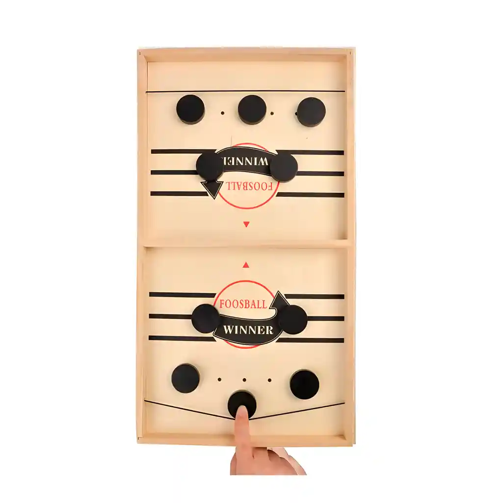 ¡Prepárate para una explosión de adrenalina y risas con el adictivo juego de mesa "Foosball Winner"! Este trepidante duelo de habilidad para dos jugadores te reta a usar la banda elástica para lanzar todas tus fichas al campo contrario a través de la pequeña compuerta central antes que tu oponente. Es una emocionante carrera de velocidad, precisión y reflejos que garantiza una competencia amistosa y momentos inolvidables para niños y adultos por igual, convirtiéndolo en la estrella de cualquier reunión familiar, fiesta con amigos o tarde de juegos. Fabricado en madera de alta calidad para mayor durabilidad, este juego es la alternativa perfecta para desconectarse de las pantallas, mejorar la coordinación mano-ojo y compartir un desafío lleno de acción. ¡Acepta el reto, afina tu puntería y demuestra quién es el campeón más rápido! Ficha Técnica: Dimensiones del producto: 34 cm x 20 cm x 2 cm Material: Madera Edad Apta : + 3 Años Certificado de conformidad: SL-CS-210043 Referencia: DM1504 ** _Para defectos de fábrica o retractos: \_Por favor revise el producto apenas lo reciba y antes de usarlo. No aplican ley de retracto o defectos de fábrica luego de usar el producto. Se manejan máximo 5 días para reportar defectos de fábrica (por ejemplo, producto funciona mal, piezas faltantes, rotas, etc). Para hacer efectiva la devolución el producto debe devolverse con el empaque original, el cual debe estar en buen estado, incluir todos los documentos y las partes completas y sin daños.