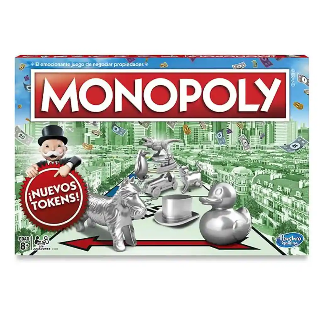 Marca Hasbro Nombre del juego de mesa Monopoly Edición Clásico Modelo alfanumérico C1009 Otras características Tipo de juego: Estrategia Componentes del juego: Tablero, 8 tokens, 28 títulos de propiedad, 16 cartas de fortuna, 16 cartas de arca comunal, 32 casas, 12 hoteles, 2 dados, Paquete de dinero Monopoly, Reglamento Edad mínima recomendada: 8 años Cantidad mínima de jugadores - Cantidad máxima de jugadores: 2 - 8 Idiomas: Español