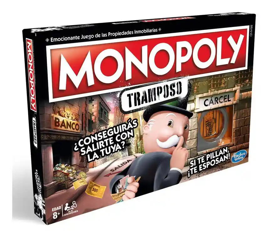 ¡Hacer trampa está permitido! En esta versión de Monopoly las reglas se tuercen, se pide prestado dinero y se aceptan negocios divertidos. Las extravagantes sugerencias en la pizarra, las tarjetas y las reglas alientan a los jugadores a expresar su tramposo interior mientras compran, venden y planifican. Fingir una tirada de dados, robar algunas facturas del banco e incluso saltearse el alquiler. ¡Completa un truco para obtener una recompensa, pero deja de hacer trampa y paga las consecuencias!INCLUYE ESPOSAS DE PLÁSTICO: ¡Que no te atrapen! Este juego Monopoly incluye esposas de plástico para que los jugadores que hacen trampa queden encadenados a la casilla de la cárcelPRESENTA TARJETAS DE TRAMPA: Las tarjetas de Trampa inducen a los jugadores a hacer trampa y les sugieren qué trampas realizar. Si realizas la trampa con éxito, tendrás una recompensa, si fallas, pagarás las consecuenciasDIVERTIDO JUEGO FAMILIAR: Reúne a familia y amigos para jugar a este juego Monopoly completamente diferente. Prepárate para reír a carcajadas cuando los jugadores deben romper las reglas como parte del juegoGANA QUIEN TIENE MÁS DINERO: Las sugerencias en el tablero, tarjetas y reglas invitan a hacer trampa para adueñarse de todo. El jugador que tenga más dinero al final del juego, gana