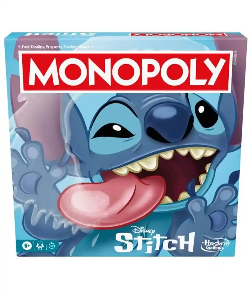 ¡Crea un día perfecto con Stitch en el juego de mesa Monopoly Edición Disney Stitch! En esta edición, las propiedades son remplazadas por actividades favoritas de Stitch, como un Espectáculo de Hula y Chillax, así como artículos de alquiler en la playa Primero, cada jugador elige un peón único de Stitch. A continuación, recorre el tablero intentando reunir tantas actividades y artículos de alquiler en la playa como pueda. ¡Cuanto más reúna un jugador, más emocionante será su día con Stitch y más alquiler podrá cobrar a otros jugadores! Obtén un grupo de color para añadir Cabañas de Playa y Faros y poder cobrar todavía más alquiler Roba cartas de 626 y de Ohana para llevar a cabo acciones que cambiarán el juego. ¡El último jugador que quede activo cuando todos hayan caído en bancarrota será el ganador! Este juego de mesa estratégico es una divertida opción para jugar en familia y es un excelente regalo para los niños, niñas, adolescentes y adultos que son fans de Stitch. Edad recomendada: A partir de 8 años Los nombres y logotipos de Hasbro y Monopoly, el diseño distintivo del tablero, las cuatro casillas de las esquinas, el nombre y el personaje de Mr. Monopoly, así como cada uno de los elementos distintivos del tablero y piezas de juego, son marcas registradas de Hasbro, Inc. para su juego de las operaciones inmobiliarias y equipo del juego Advertencia de uso A partir de 8 años Para 2 a 4 jugadores Incluye: 1 tablero, 4 peones de plástico, 18 tarjetas de Título de Propiedad, 16 cartas de Ohana, 16 cartas de 626, 32 Cabañas de Playa de plástico, 12 Faros de plástico, 2 dados, paquete de dinero e instrucciones.. Advertencia: •Contiene partes pequeñas que podrían producir asfixia. •Utilizar bajo supervisión de un adulto •Quitar la etiqueta, sujetadores y bolsas antes de entregar el producto a sus niños •Mantenerlo lejos del fuego. •Todos los productos podrían causar daño si no se usan con precaución.