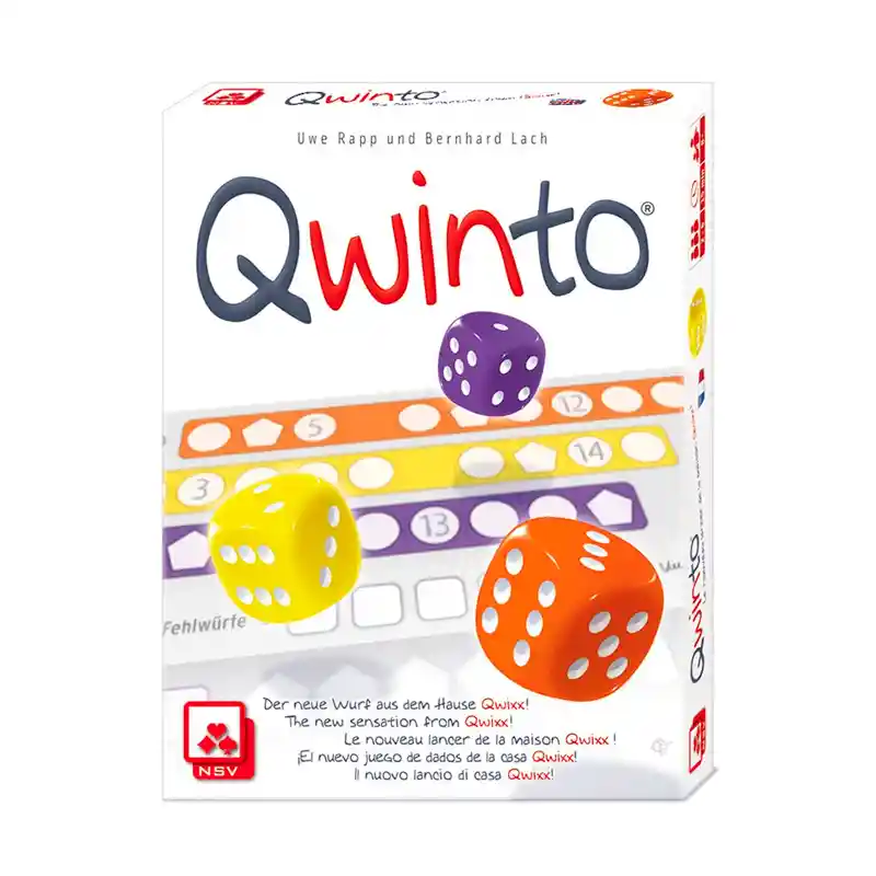 Qwinto es un divertido juego de dados con partidas rápidas y dinámicas donde todos los jugadores juegan de forma simultánea, intentando rellenar su hoja lo más rápido posible a la vez que intentan obtener la mayor puntuación.Un jugador no tiene que escribir el número en una fila, pero si el jugador activo, el que tiró los dados, no lo hace, entonces deben hacer una cruz en una de sus casillas de “fallo”. El juego continúa hasta que alguien ha llenado dos filas en hoja o ha marcado sus cuatro casillas de “fallo”. Cuando esto ocurre, los jugadores calculan sus puntos: por cada columna completada en su hoja, el jugador obtiene puntos iguales al número en el pentágono de esa columna. Por cada fila completada en su hoja, el jugador obtiene puntos igual al número de la derecha en esa fila. Por cada fila incompleta en su hoja, un jugador anota un punto por número en esa fila. Para cada “fallo”, un jugador pierde cinco puntos. ¡Quien tenga más puntos gana la partida! Autores: Uwe Rapp y Bernhard Lach. Medidas 14 x 10 x 3. Edad recomendada a partir de 8 años.