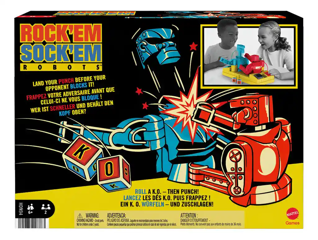 America Store te trae Juego de Mesa ROCK 'EM SOCK 'EM Juegos de mesa familiares Clásico juego para volver al cuadrilátero Controla toda la diversión llena de golpes y bloqueos Resumen del producto El juego Rock 'Em Sock 'Em Robots™ ha sido un nocaut desde 1964, pero presenta algo diferente en esta edición: ¡un dado que determina quién golpea y quién bloquea!. Los controles manuales en las palancas de mando del cuadrilátero ponen a los jugadores a cargo de toda la diversión llena de golpes y bloqueos. Sin embargo, en esta edición, el dado determina qué robot debe ponerse a la defensiva y presionar el botón de BLOQUEAR, ¡Mientras que el otro pasa a la ofensiva y usa su botón de golpe para GOLPEAR! ¡Pídelo en línea y adquiere diversión!
