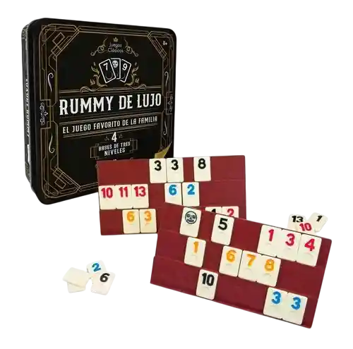 Rummy de Lujo es un juego de estrategia y habilidad que pone a prueba la capacidad de los jugadores para planificar y visualizar jugadas. El objetivo del juego es combinar las fichas en series de escaleras del mismo palo o en grupos de tres o más fichas para deshacerse del mayor número posible de fichas antes que los demás jugadores. El juego incluye 106 fichas grabadas, 4 bases de 3 niveles y un dado. Se recomienda para mayores de 8 años y puede ser jugado por 2 a 4 jugadores. Rummy de Lujo fomenta el desarrollo de habilidades estratégicas, concentración, memoria y observación.
