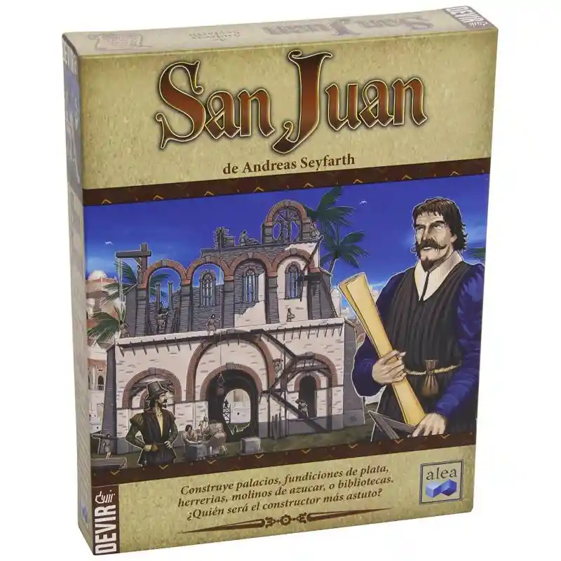 Juego de Mesa San Juan Calificación BGG: 7.2 Construye palacios, fundiciones de plata, herrerías, molinos de azúcar, o bibliotecas. ¿Quien será el constructor más astuto? San Juan está inspirado en el famoso juego de gestión de recursos Puerto Rico. Se trata de una versión más ligera y rápida del juego, en la que los jugadores usan sus cartas de edificios como fábricas, edificios singulares con poderes especiales, o monedas para pagar el resto de edificios. Al igual que en Puerto Rico, los jugadores eligen en su turno qué papel quieren desempeñar durante ese turno, y gozan de ventajas para sus acciones durante ese turno. Tipo de Juego: Competitivo Tiempo de Juego: 45 a 60 minutos Número de jugadores: 2 a 4 Edad: De 10 años en adelante Contenido del Juego - 110 cartas de edificio - 1 loseta de gobernador - 5 losetas de personaje - 5 losetas de casa de comercio - 1 bloc de puntuación - 1 lápiz
