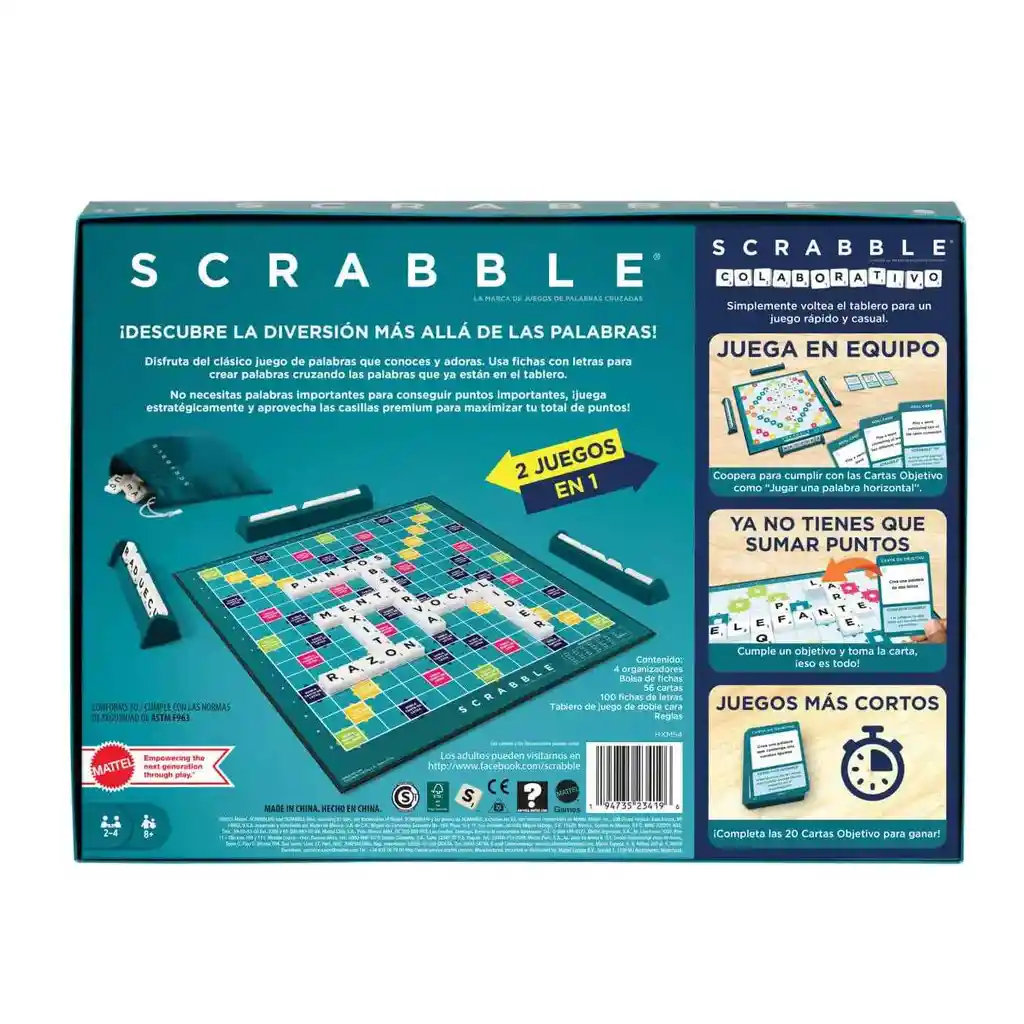 6 años + Descubre una nueva forma de jugar Scrabble con esta edición colaborativa que incluye dos juegos en uno. Este clásico juego de palabras ha sido rediseñado para ofrecer una experiencia de juego en equipo, donde los jugadores cooperan para cumplir objetivos específicos mientras forman palabras en el tablero. ¡No es necesario sumar puntos, solo completar las metas para ganar! La edición colaborativa de Scrabble es perfecta para aquellos que buscan partidas más rápidas y dinámicas. Con cartas de objetivos que desafían a los jugadores a crear palabras específicas, cada partida es única y llena de estrategia. Además, si prefieres el juego clásico, simplemente voltea el tablero y disfruta del Scrabble tradicional que todos conocen y aman. Ideal para 2 a 4 jugadores, esta versión de Scrabble es un excelente regalo para amantes de los juegos de palabras y para aquellos que disfrutan de desafíos en grupo. El juego viene con un tablero reversible, fichas de letras, atriles y cartas de objetivo, todo empaquetado en un diseño moderno y atractivo. ¡Prepárate para horas de diversión educativa con Scrabble colaborativo! Tamaño: 35x 35x 4cm