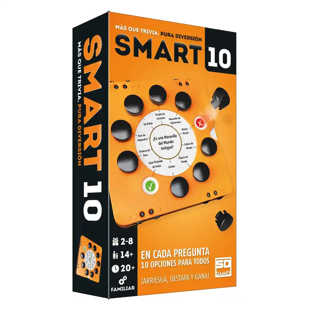Juego de Mesa Smart 10 Calificación BGG: 7.4 Smart 10 es un juego de trivia con una mecánica súper práctica: en el centro hay un “disco” con una pregunta y 10 respuestas ocultas. En tu turno eliges si respondes levantando una tapa (si aciertas, te quedas con el punto; si fallas, pierdes los puntos de esa ronda) o si te plantas y aseguras lo que llevas. Esa decisión de arriesgar o asegurar es el corazón del juego: siempre estás pensando “¿me la juego por uno más o me retiro a tiempo?”. Lo mejor es que no hay tiempo muerto: todos participan en cada pregunta y la tensión va subiendo porque las respuestas se van agotando. Es rápido, portátil y adictivo: ideal para familias o grupos porque mezcla cultura general con estrategia de riesgo, y cada ronda termina con ganas de revancha. • Tipo de juego: Competitivo • Edad: 10 años en adelante • Número de Jugadores: 2 a 8 jugadores • Tiempo de Juego: 20 minutos • Dificultad (1-5): 1.17 • Idioma: Español CONTENIDO DE LA CAJA • 10 marcadores • 100 tarjetas • 1 reglamento PREMIOS Y RECONOCIMIENTOS • Nominado al premio GEEKS d'OURO 2025 a Juego del Año en la categoría de Mecánicas Innovadoras. • Ganador del Juego del Año de Spiel der Spiele 2020 • Nominado al mejor juego de fiesta de Årets Spill 2019 • Ganador del Årets Spil al mejor juego para adultos 2019 • 2019 Årets Spil Nominado al Mejor Juego para Adultos • Ganador del Årets Spel al mejor juego para adultos 2017 • 2017 Årets Spel Nominado al Mejor Juego para Adultos Recuerda, somos TIENDA MOVITEC.